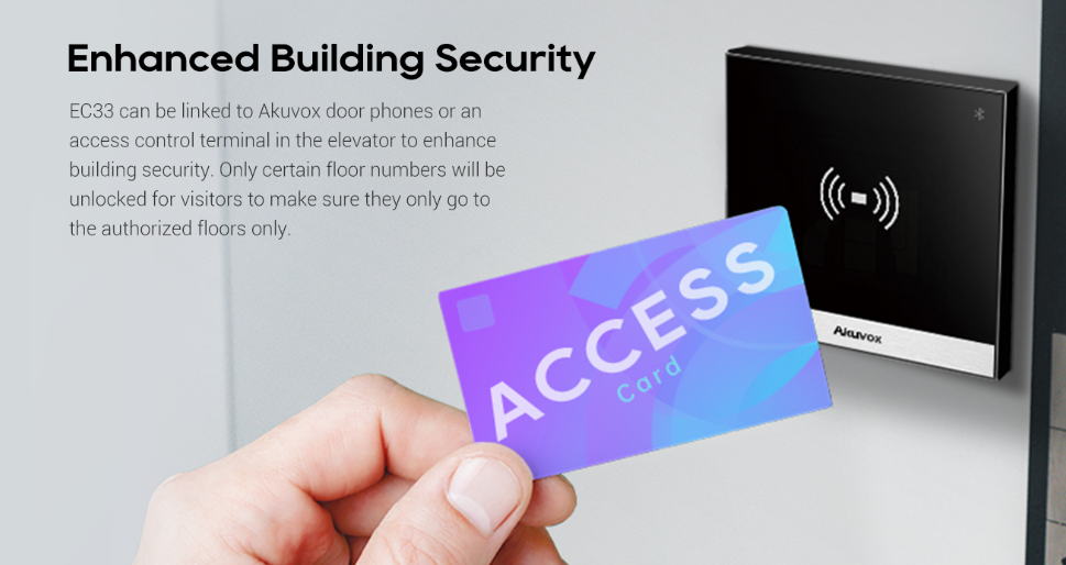IP tabanlı asansör yetkilendirme terminali olan EC33 tüm Akuvox interkom ve geçiş kontrol terminalleri ile entegre bir biçimde çalışabilir. Ürün Akuvox bulut sistemi ile entegre olarak, SmartPlus mobil uygulaması üzerinden asansör çağırma işlemi hızlı ve basit bir biçimde yapılabilir.
