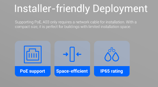 A03S, bir kart okuyucu ve bir kapı giriş kontrol cihazını birleştiren IP tabanlı bir erişim kontrol terminalidir. Bluetooth aracılığıyla telefonu sallayarak kilit açma, NFC teknolojisiyle mobilden erişim ve RFID kartı ile giriş imkanlarını sunmaktadır.