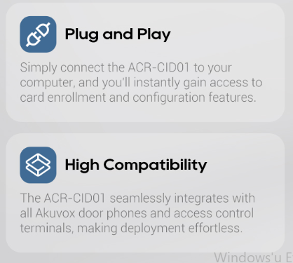 ACR-CID01, modern erişim kontrol sistemleri için özel olarak tasarlanmış, verimli ve çok işlevli bir masaüstü kart okuyucusudur. Bkey/RFID erişim kartlarındaki bilgileri hızlı bir şekilde okumak için USB arayüzü aracılığıyla bir bilgisayara bağlantıyı destekler.